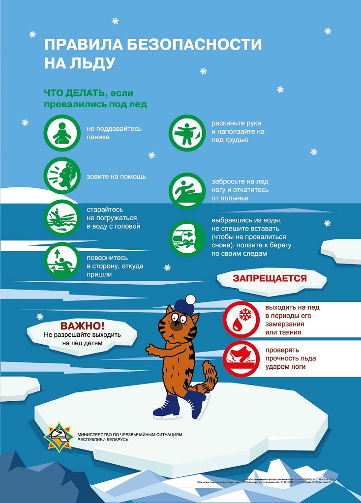 МЧС напоминает! Если провалились под лед: не паникуйте; зовите на помощь; старайтесь не погружаться в воду с головой; раскиньте руки и наползайте на лед грудью; забросьте на лед ногу и откатитесь от полыньи; выбравшись из воды, не спешите вставать, ползите к берегу по своим следам; ищите, где согреться и сменить одежду.